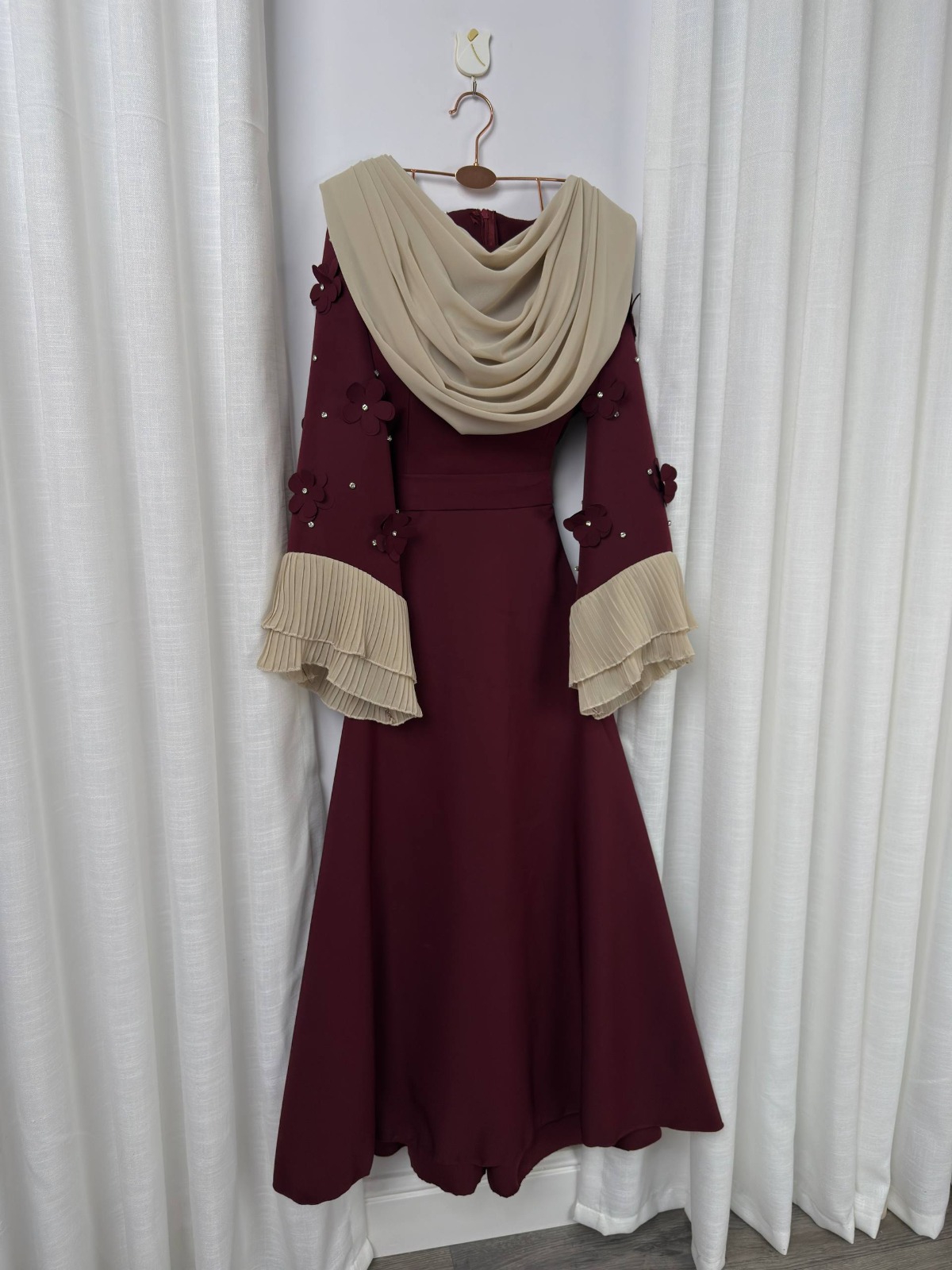 فستان ميدي باربي بشال واطراف اكمام شيفون مطرزة باللؤلؤ