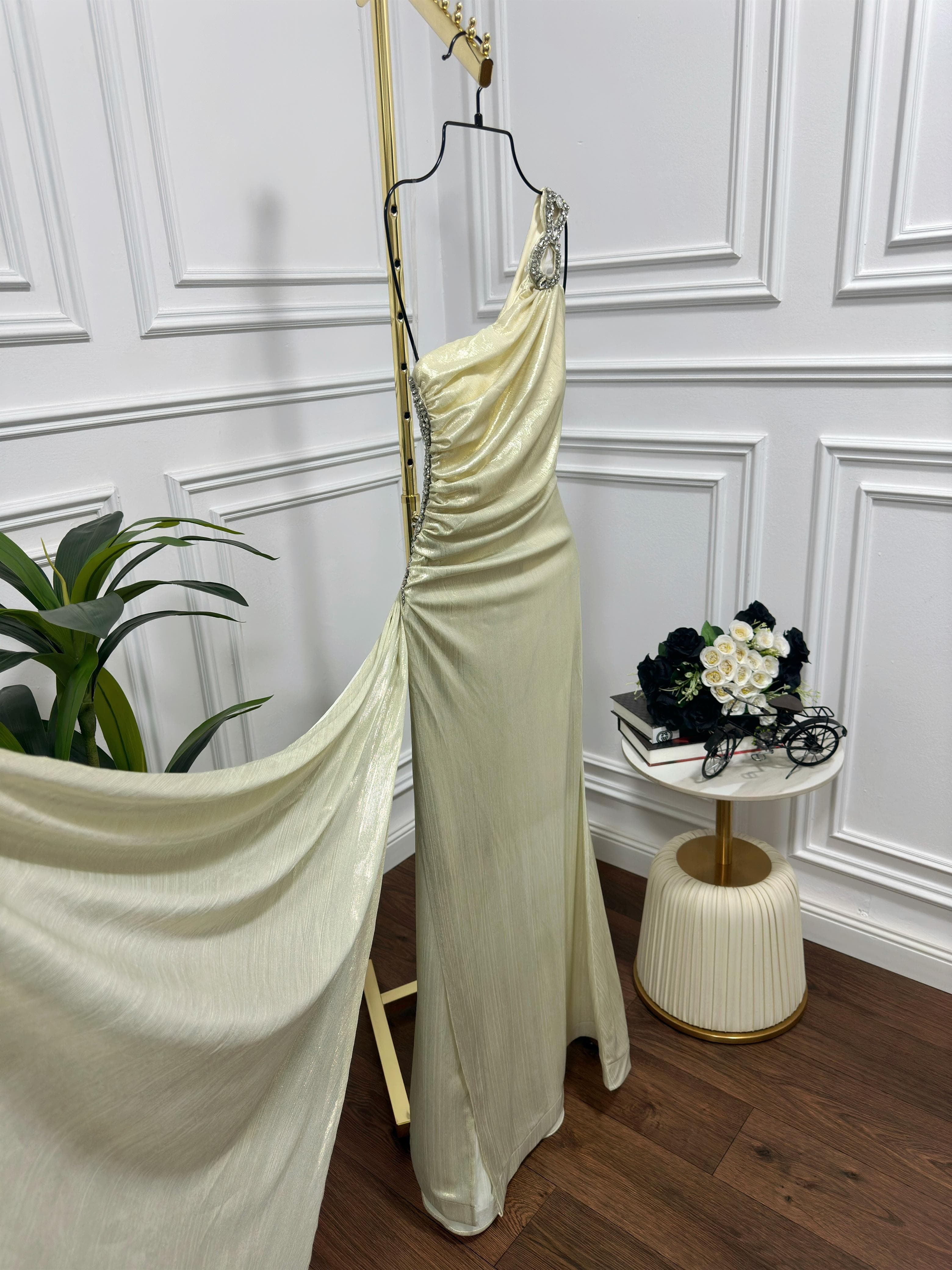 الوصف/ فستان سهره طويل خام كرنكل مزين بالكرستال