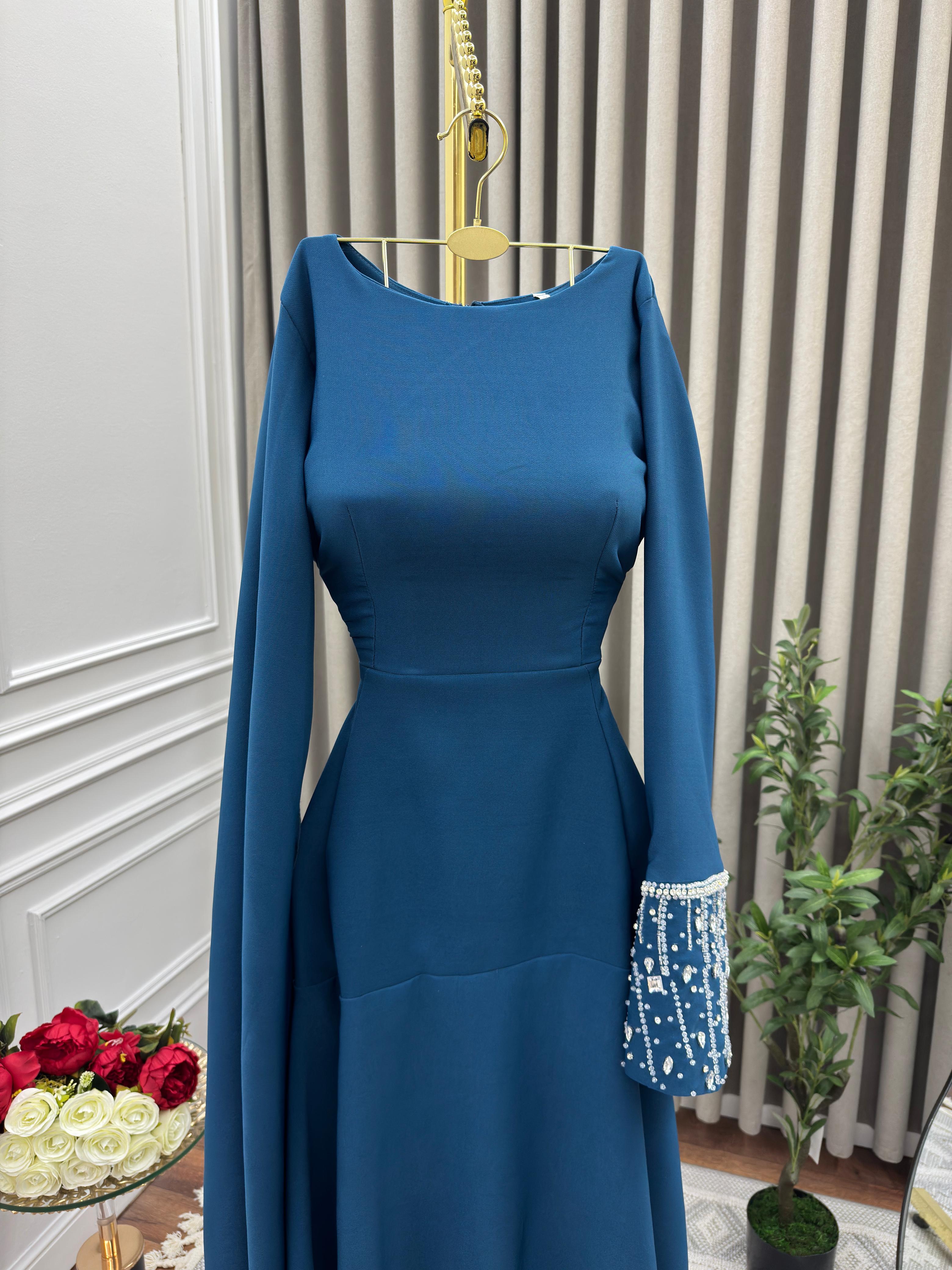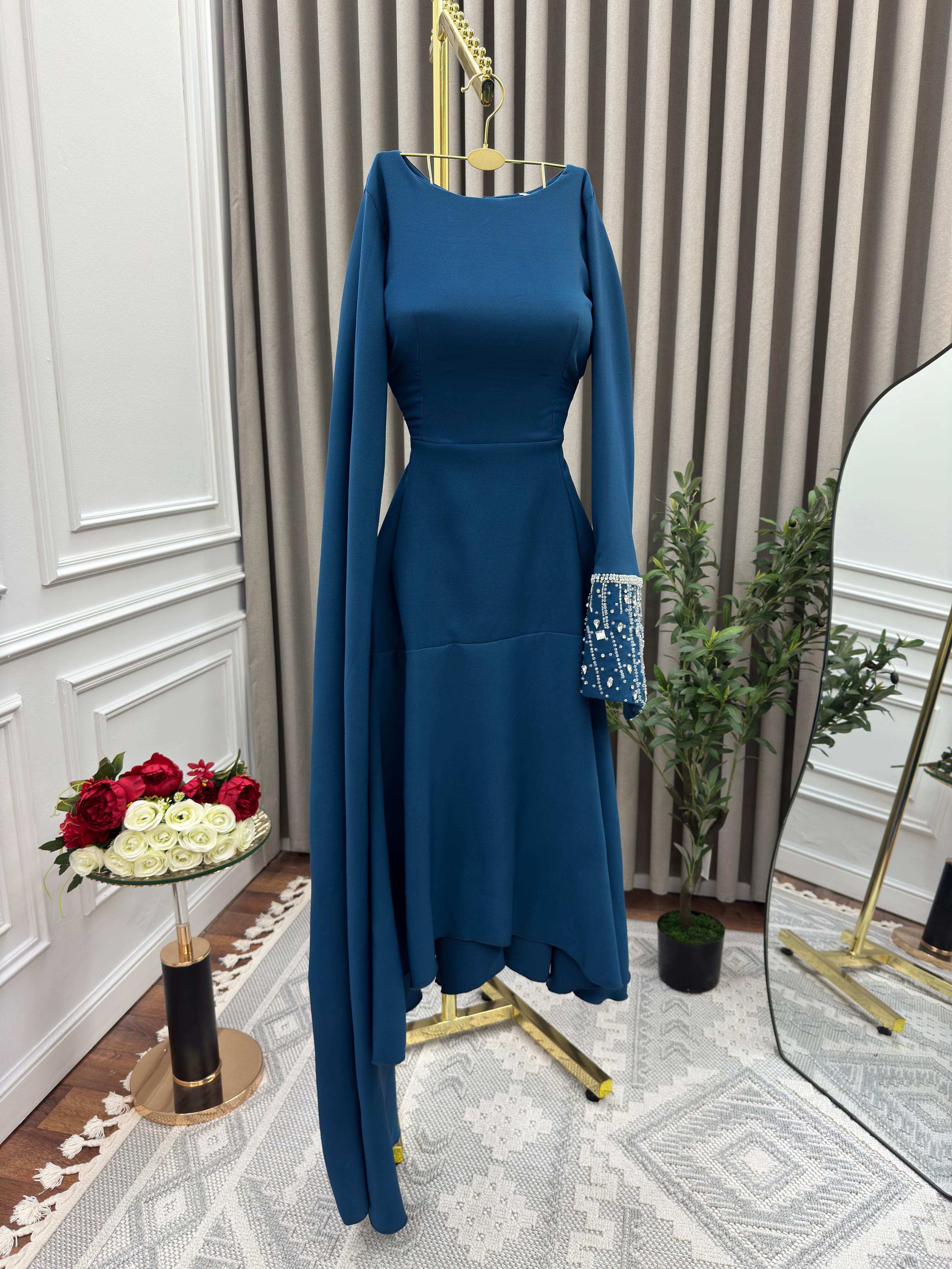 فستان ماكسي طويل باللون الأزرق المائل للأخضر (Teal) أو التركوازي، يتميز بتصميمه الواسع والمنسدل، مع أكمام طويلة