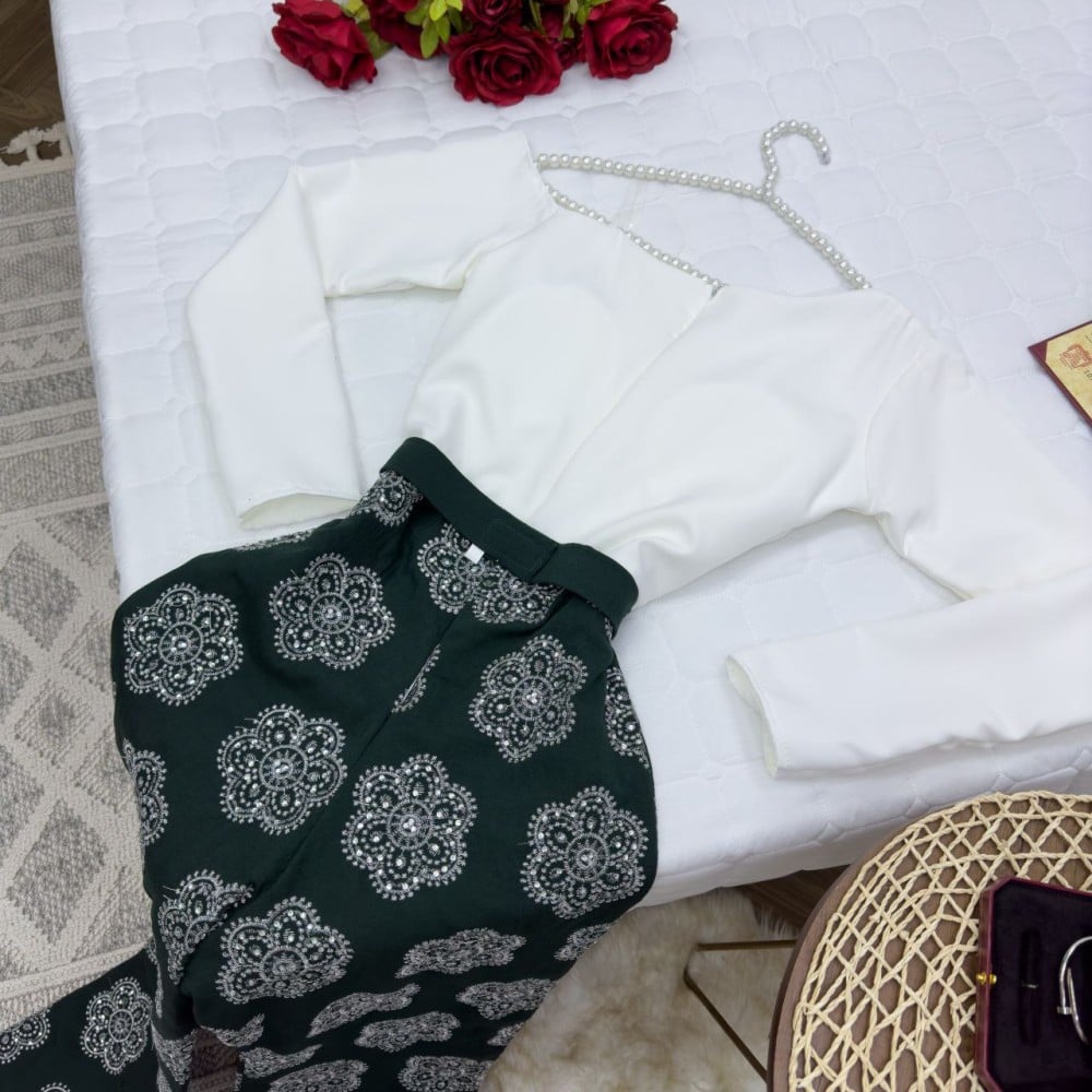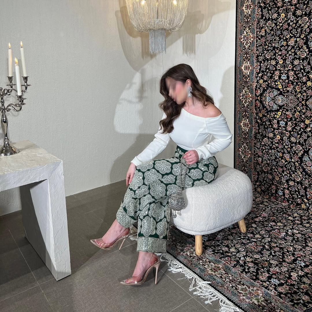 تألقي بإطلالة أنيقة وعصرية مع هذا البنطال الواسع (بلازو) باللون الأخضر الداكن. صُمم بتطريزات وزخارف بيضاء فاخرة تضيف لمسة تراثية جذابة. مثالي للمناسبات والسهرات، كما يمنحك راحة وأناقة في نفس الوقت. يمكن تنسيقه بسهولة مع بلوزة بسيطة لإبراز تفاصيله الراقية.