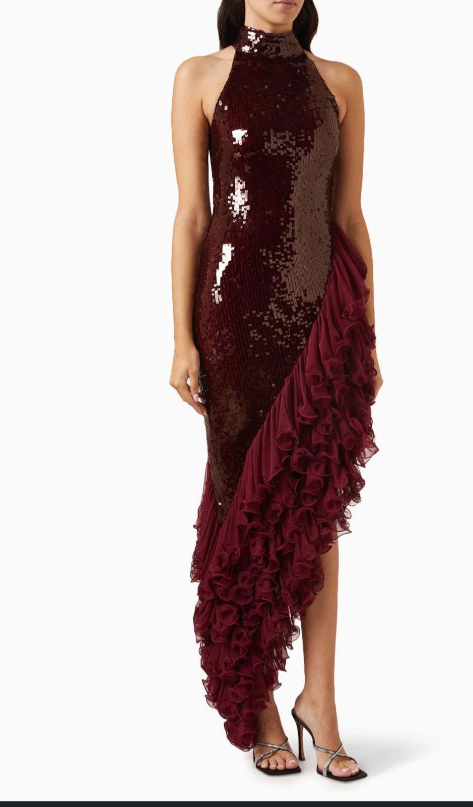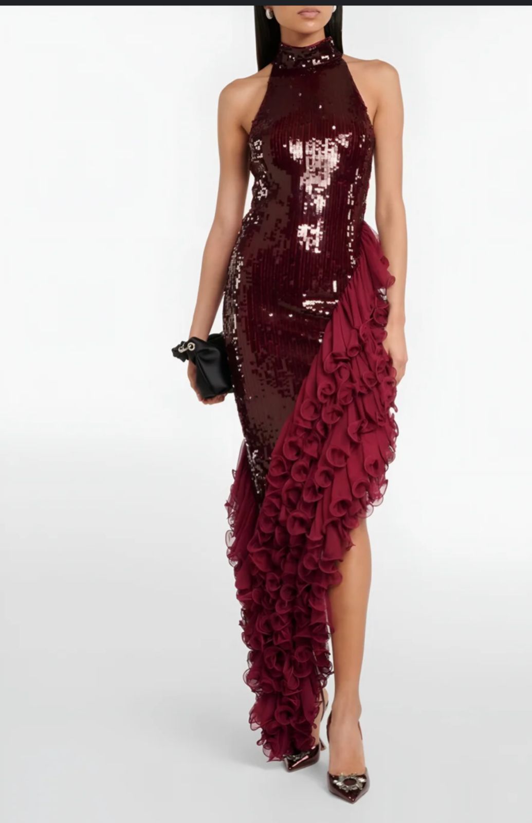 - يبرز تفصيل الكشكشة الكبيرة المصنوعة من قماش الشيفون أو التول الرقيق باللون العنابي نفسه، والتي تمتد بشكل دراماتيكي على جانب واحد من الفستان، من الخصر وحتى الأسفل، مما يضفي لمسة أنثوية ومميزة.
