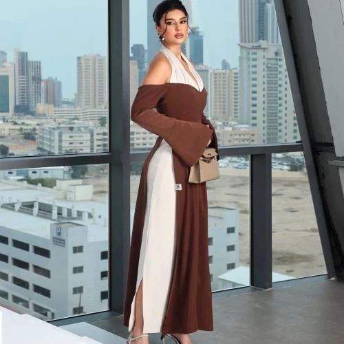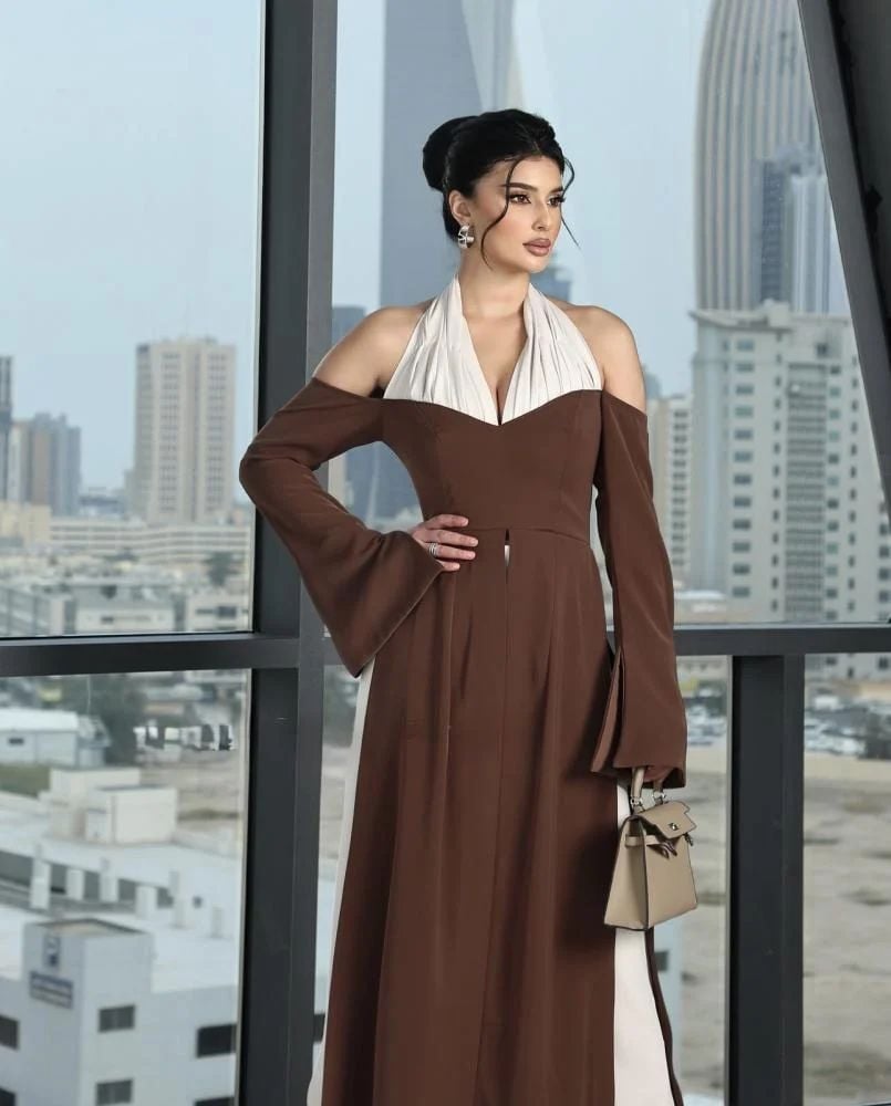 فستان سهرة أنيق يجمع بين اللونين البني الدافئ والأبيض.