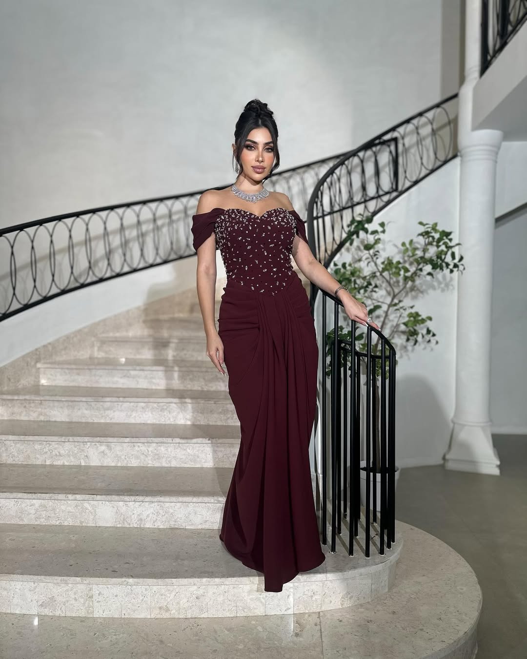 • يتميز بتصميم مكشوف الأكتاف (Off-shoulder) مع ياقة على شكل قلب (Sweetheart neckline).