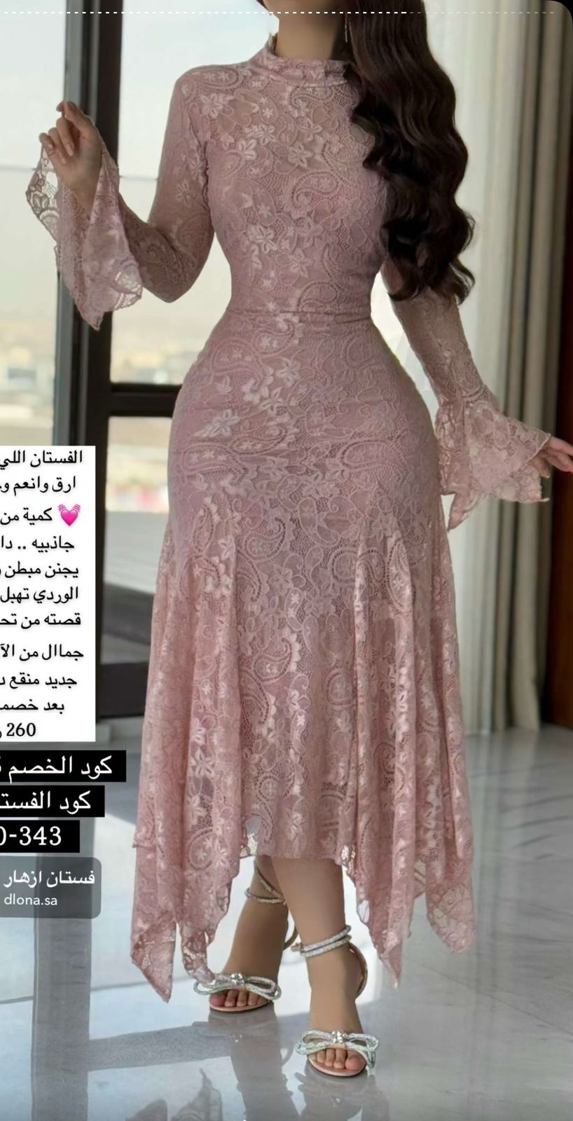 - القصة: قصة ضيقة من الأعلى تبرز القوام، ثم تتسع تدريجياً نحو الأسفل بشكل انسيابي مع أطراف غير متساوية الطول (كلوش أو ذيل سمكة).