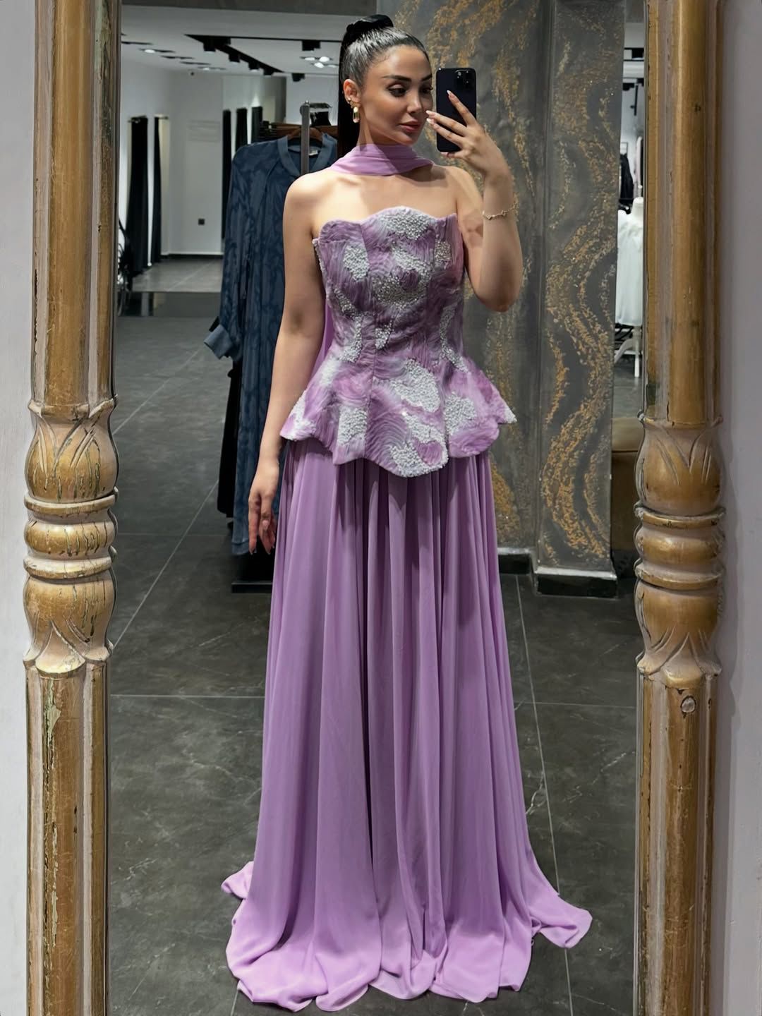 - يتميز بتصميم بدون حمالات (strapless) مع ياقة عالية (halter neck) متصلة بالجزء العلوي. الصدرية مزينة بتطريز أو نقشات بارزة باللون الرمادي الفاتح أو الفضي، مما يضيف لمسة من الفخامة.
