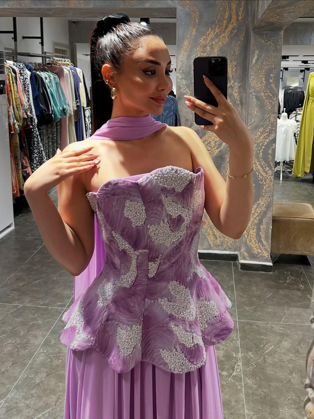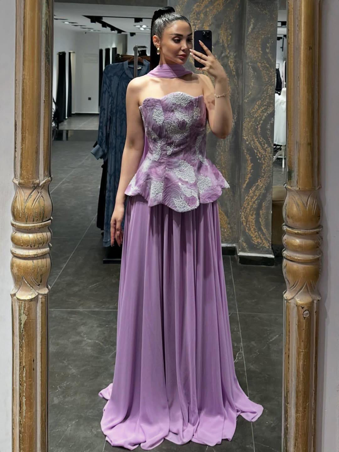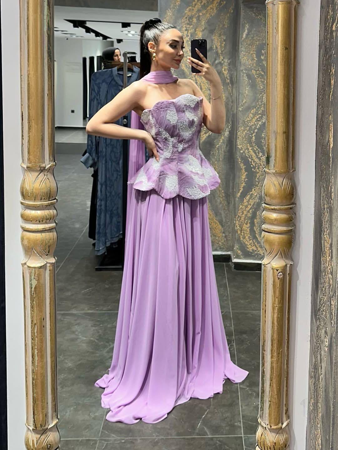 - يجمع الفستان بين قماش التور الفرنسي المطرز في الجزء العلوي وقماش الجورجيت في التنورة، مما يضفي عليه مظهراً عصرياً ومواكباً للموضة.