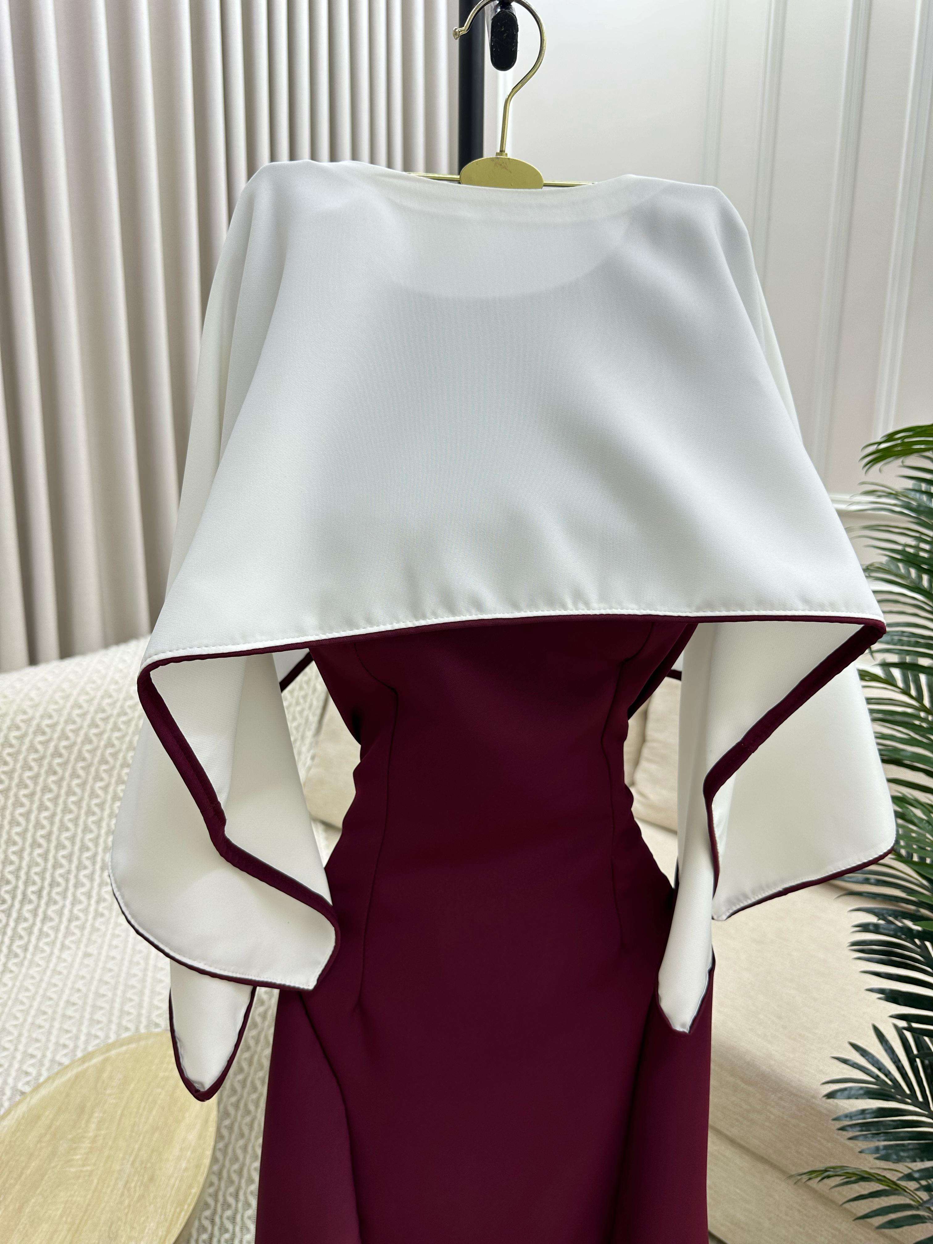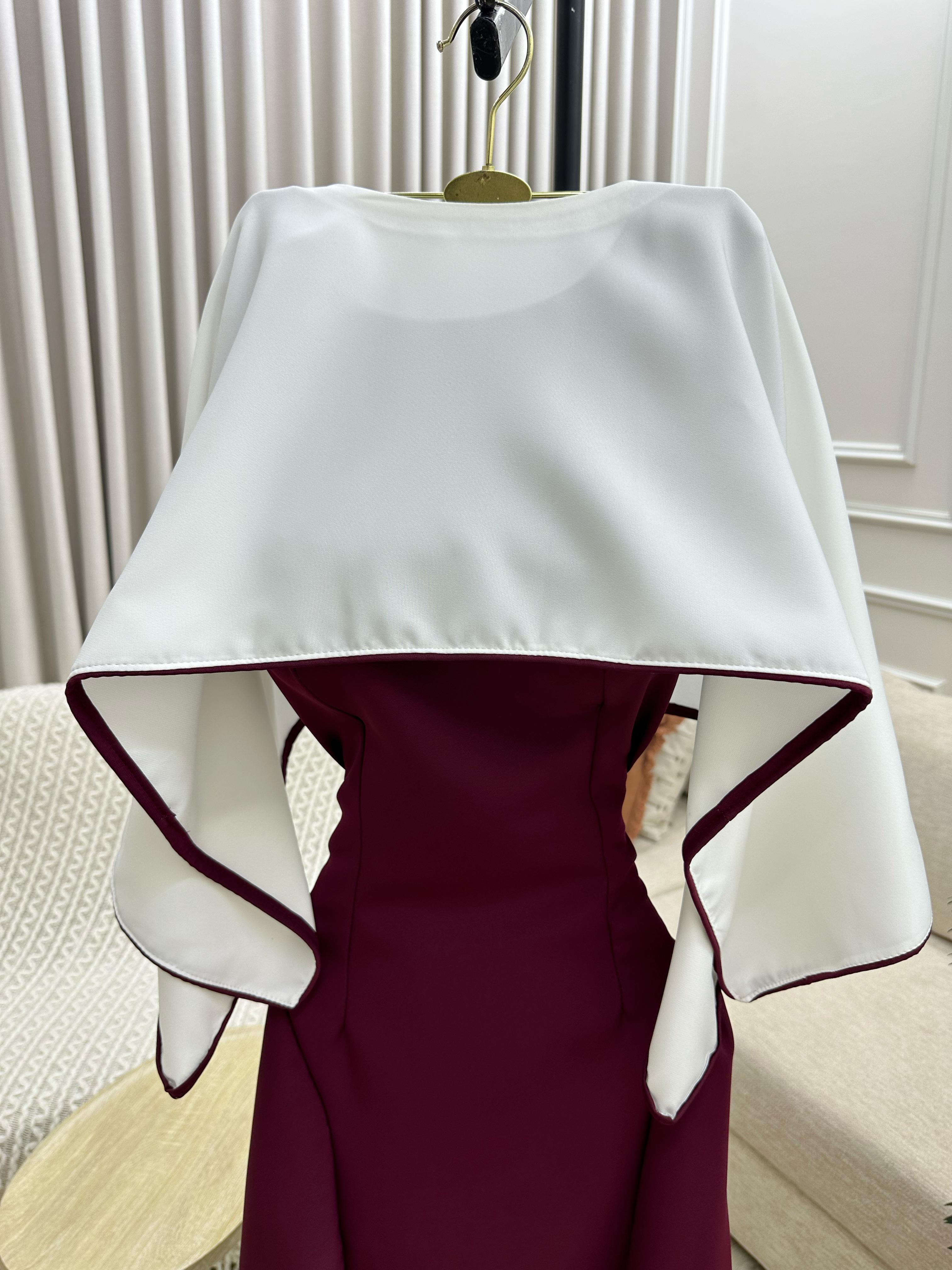 - القطعة العلوية البيضاء ذات أكمام واسعة أو "كاب" تتدلى بأناقة على الذراعين.