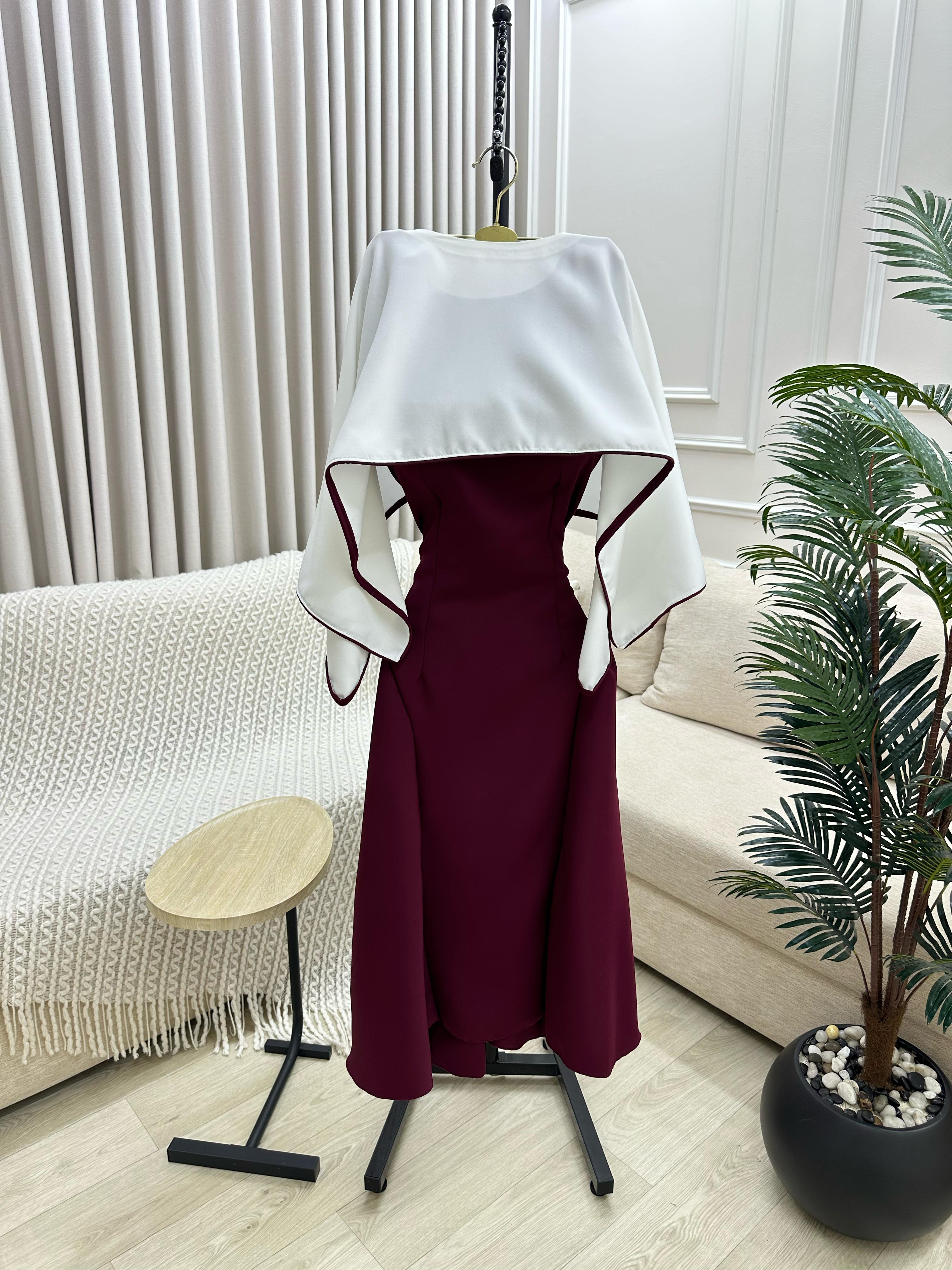 - الفستان باللون العنابي الداكن، ويبدو مصنوعًا من قماش ناعم ولامع، ربما الساتان أو قماش مشابه يوفر انسيابية في الحركة.