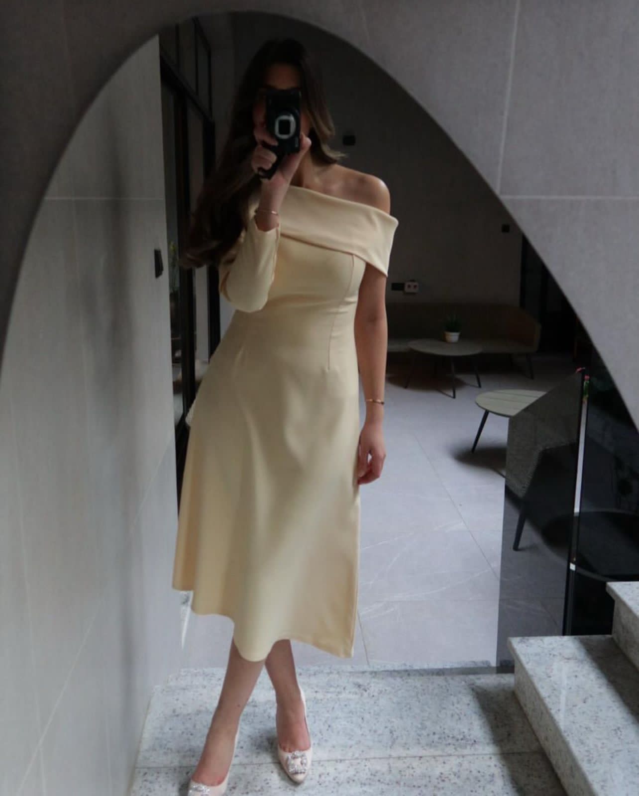 - يأتي الفستان بقصة مستقيمة أو شبه مستقيمة (شيفت) تنساب بنعومة على الجسم، ويصل طوله إلى منتصف الساق تقريبًا (ميدي)، مع سحاب مخفي في الخلف لسهولة الارتداء.