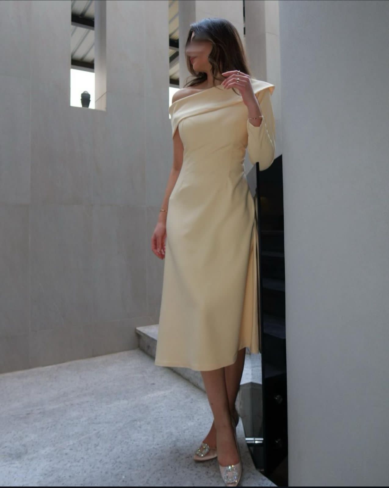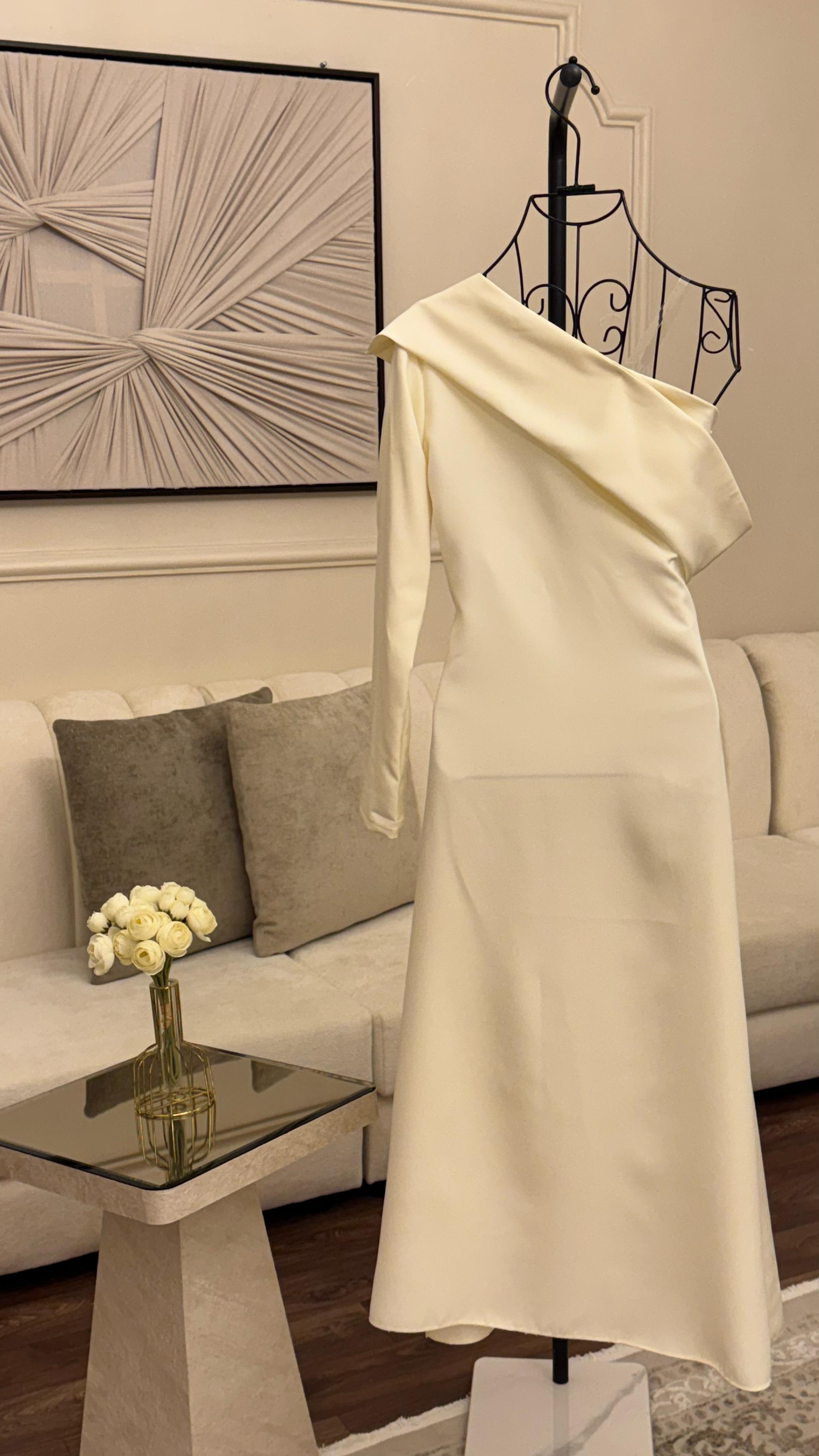 - يتميز الفستان بكتف واحد مكشوف (One-shoulder) مع تصميم درابيه أو ثنيات أنيقة عند الصدر والكتف، بينما يغطي الكم الآخر الذراع بالكامل.