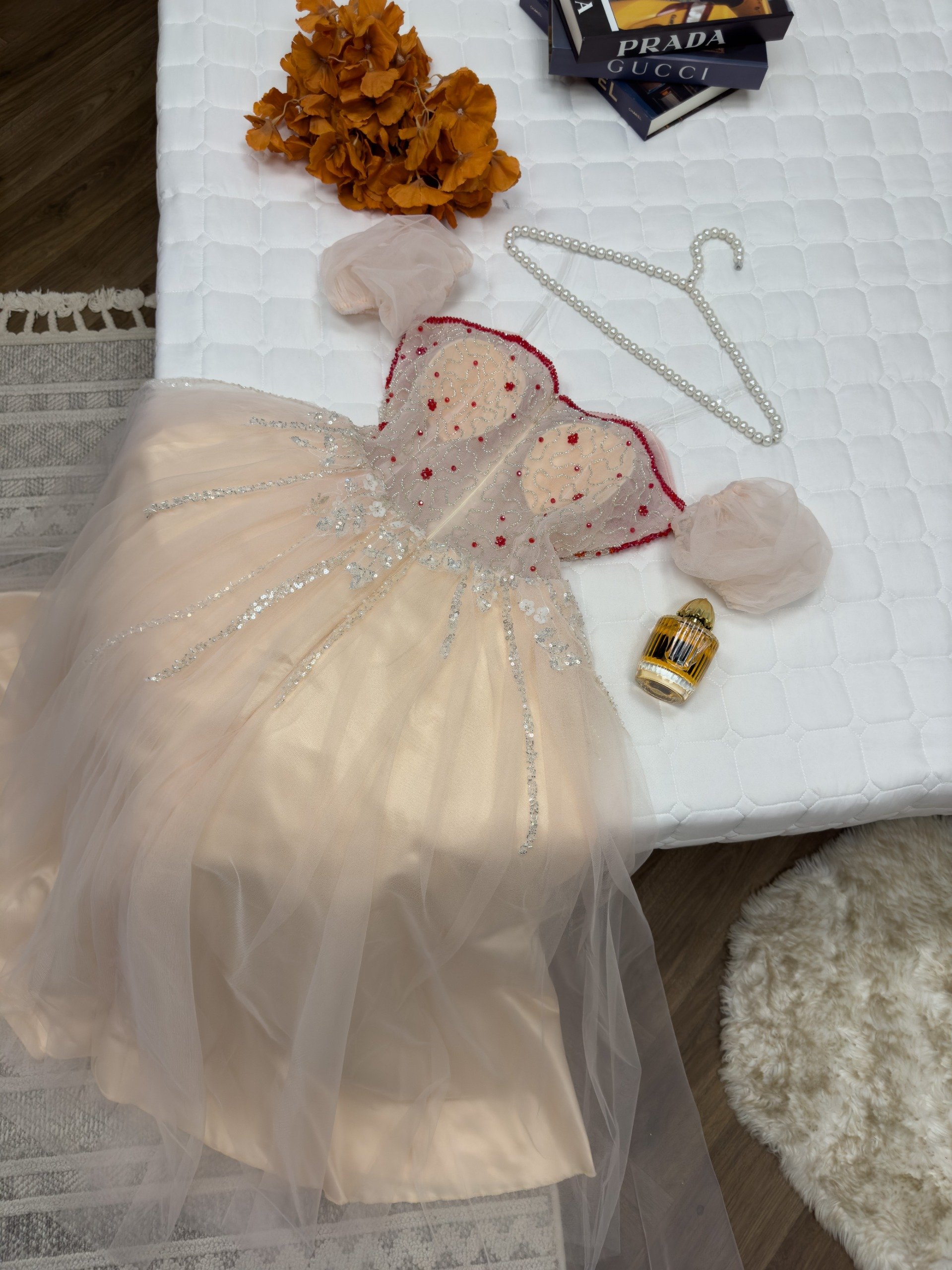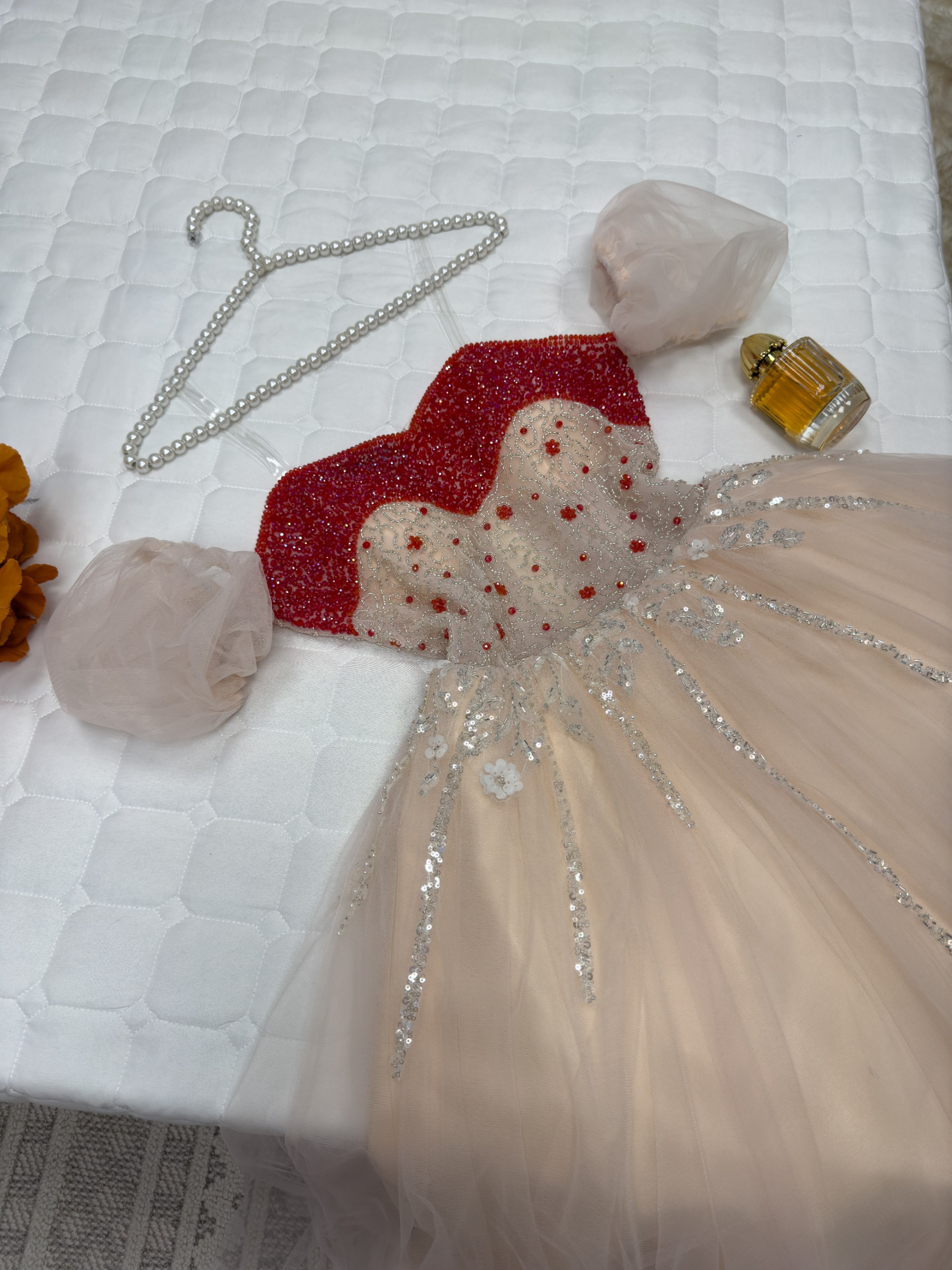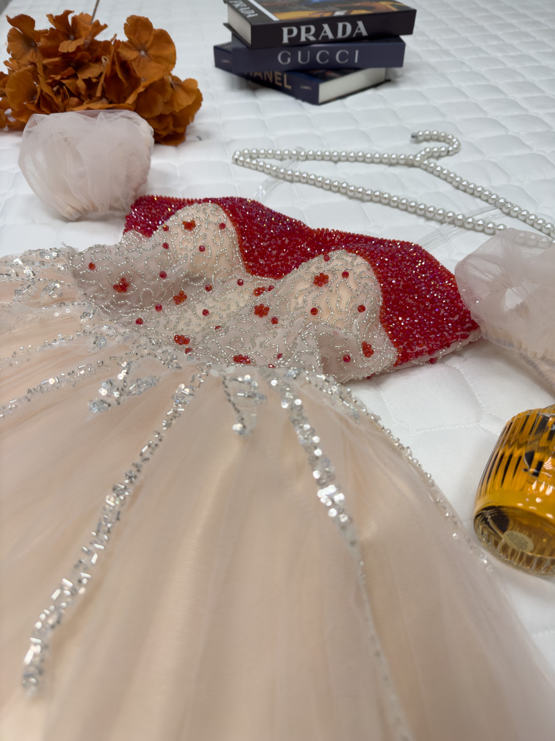 - الجزء العلوي من الفستان (الكورسيه) مطرز بالخرز اللامع والترتر، ويظهر تطريز أحمر على شكل قلوب صغيرة أو نقاط متناثرة. كما يمتد التطريز اللامع على طول التنورة بشكل خطوط متفرقة.